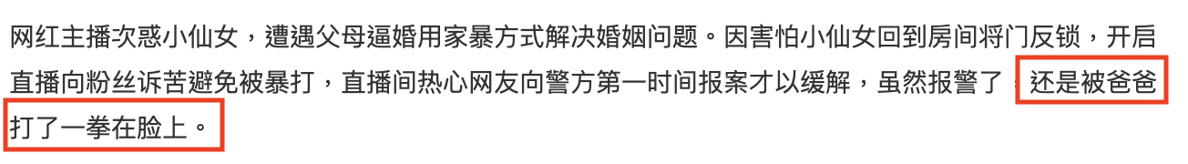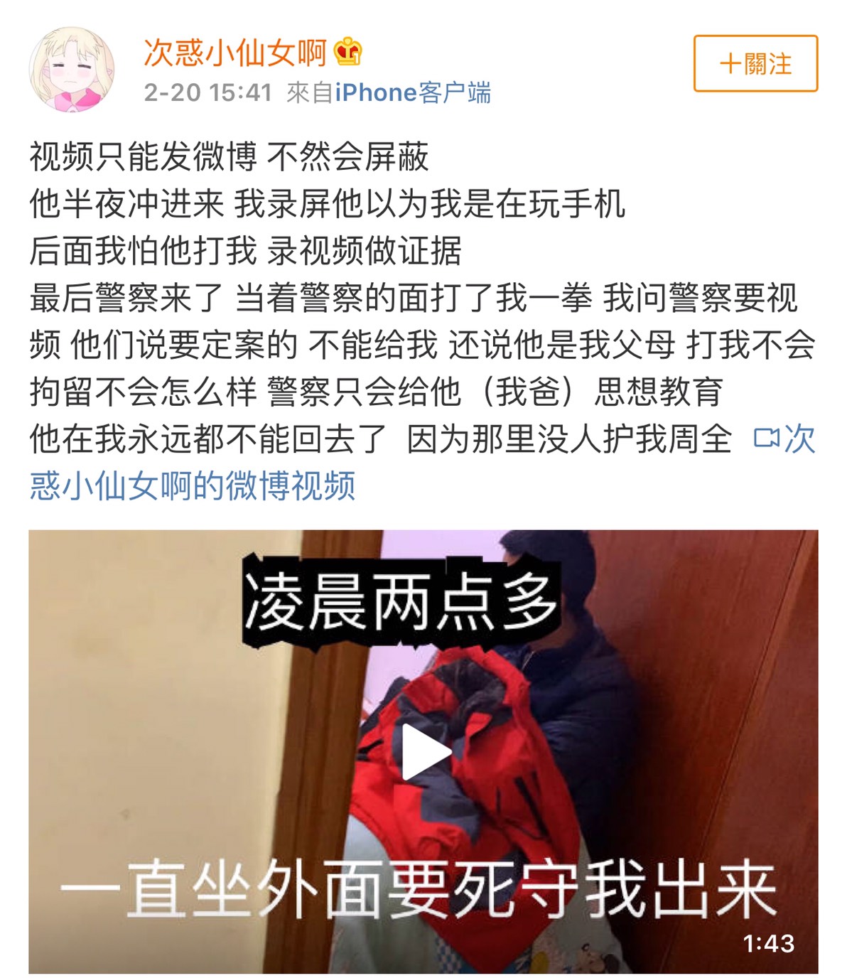 今年2月20日,次惑小仙女在個人微博張貼一段影片,並寫下:「我怕他打我,錄視頻作證,後面警察來了,當著警察打我一拳...他在我永遠都不能回去了,因為那裏沒人護我周全。」。據網上的說法提到次惑小仙女是出生在湖南益陽封建的農村裡,在益陽醫學高等專科學校就讀,父母親懷疑女兒做不正當行業,想讓她直接休學,並且要求她趕快結婚,怕她以後就嫁不出去沒有人要,更被踢爆父母早就先收了男方家的禮金,引發次惑小仙女強烈不滿且反抗這門婚事,進而遭受到父母的辱罵和家暴,引發警察到場關切。