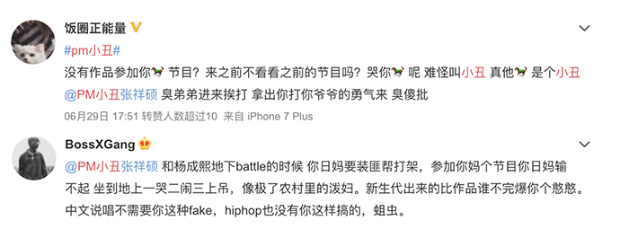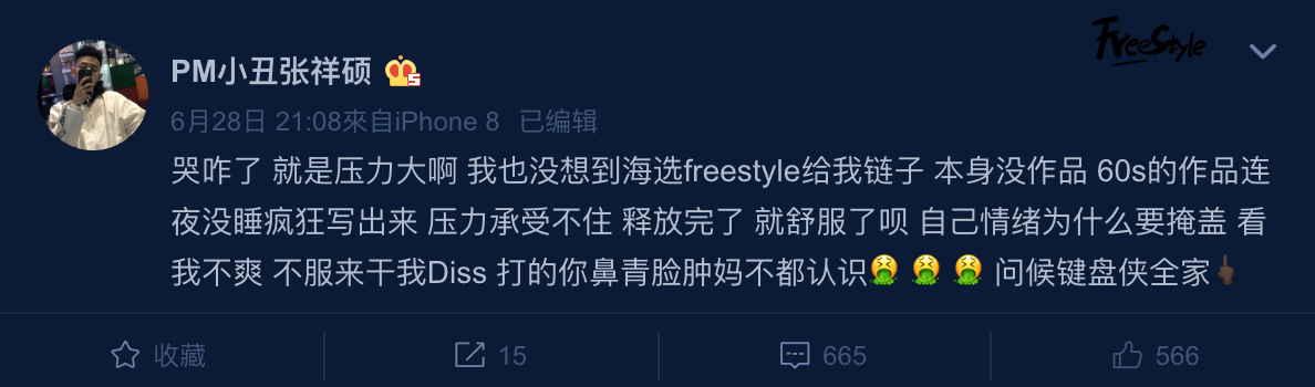 PM小丑也在微博上發文表示:「哭怎了就是壓力大啊,我也沒想到海選freestyle給我鍊子,本身沒作品60s的作品連夜沒睡瘋狂寫出來,壓力承受不住,釋放完了就舒服了唄」,更表示不懂為何要掩蓋自己的情緒,如果網路酸民看不爽的話歡迎來diss,非常的嗆辣,而在6月29號時,PM小丑更釋出一首歌曲diss,裡面的歌詞也提到:「我從來不掩飾自己的情緒,噴子別總當個檢討委員」、「但如果沒實力,孫子記住管好嘴才對」,句句都在回嗆酸民們。