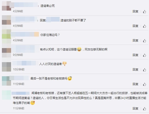 其中還有網友感到相當傻眼,認為老闆偕同女友、旗下藝人大方出國旅遊,竟被有心人抹黃造謠,這結果簡直叫人匪夷所思,並嚷嚷:「你日常生活也是不允許出現異性的嗎?」「非要24小時直播才能堵住黑子的嘴?」,替楊超越打抱不平。當然,最後還是有網友歪樓,直呼老闆女友的五官就算打上馬賽克也看得出是美女,嚷嚷著他上輩子是做了什麼好事:「怎麼能娶到這麼美的老婆?」