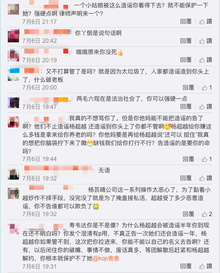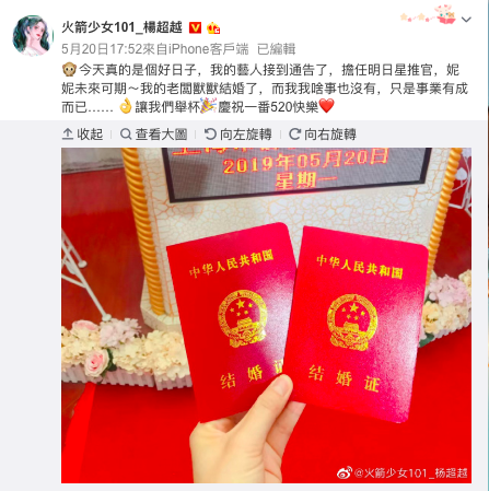 不僅如此,翻出楊超越過去的PO文,老闆明明已經於5月20日領證結婚,楊超越更發文送上祝福:「我的老闆獸獸結婚了,讓我們舉杯慶祝一番520快樂」,由此可見所有不實的傳言一口氣都透過照片說清楚、講明白了。然而也因為這樣,許多粉絲看了出面聲援,不滿謠言鬧得網路滿城風雨,損害了楊超越清純可人的形象,因此紛紛湧入老闆微博,力勸他採取法律途徑,還留言表示:「造謠不處理一下嗎」、「求你給我告」、「律師函稿快點」、「造謠犯法」。
