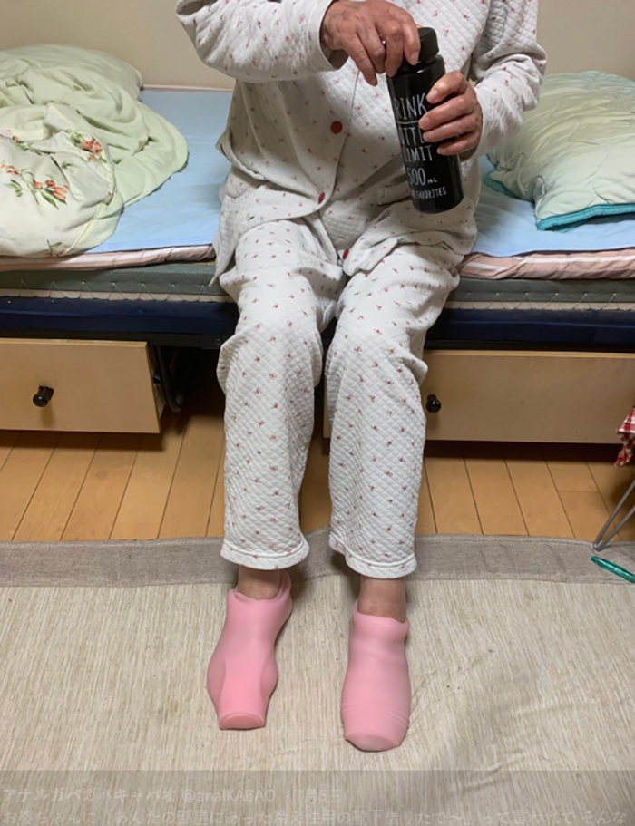 6日,一名日本男網友在個人的推特帳號新增了一部影片,影片內容是他在幫他的奶奶「脫襪子」,不過仔細一看,奶奶腳上穿的並不是襪子,而是原PO的「飛機杯」。事情是從奶奶當天覺得腳冷,告訴原PO說她從他的房間拿了一雙「保暖襪」來穿開始,原PO頓時覺得很納悶,因為他的房間根本沒有所謂的「保暖襪」,他馬上前往房間查看,只見奶奶雙腳居然都套上了粉紅色的「飛機杯」,讓場面尷尬指數破表。
