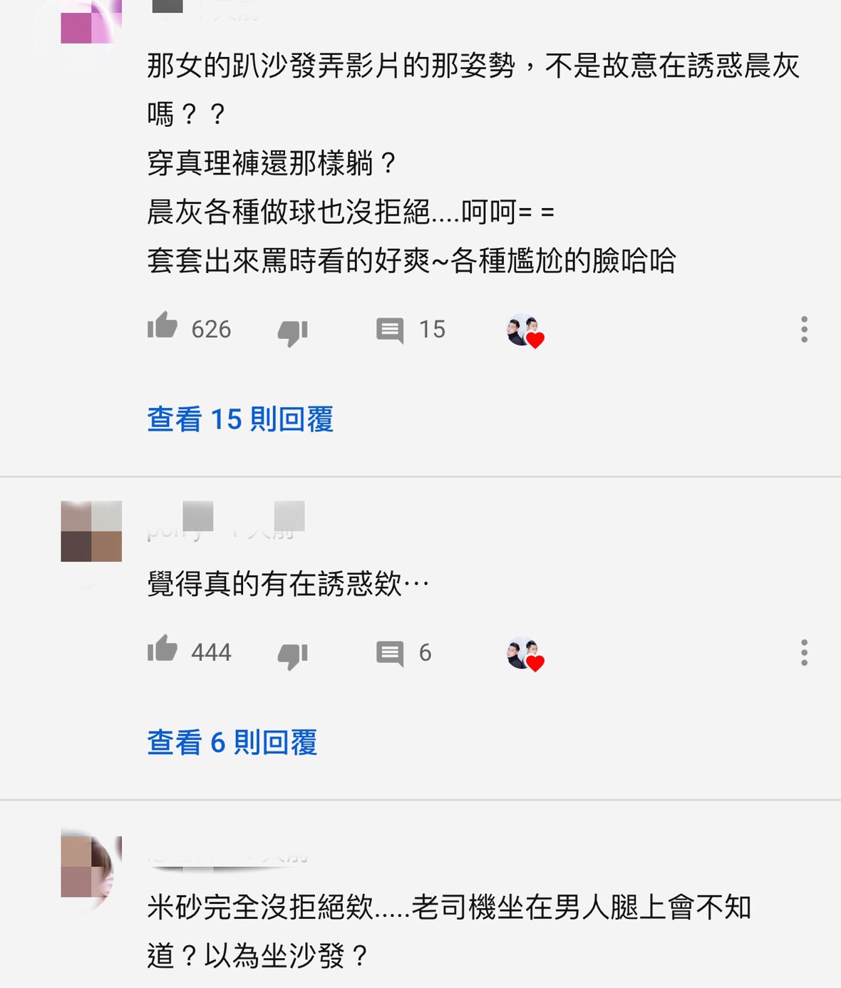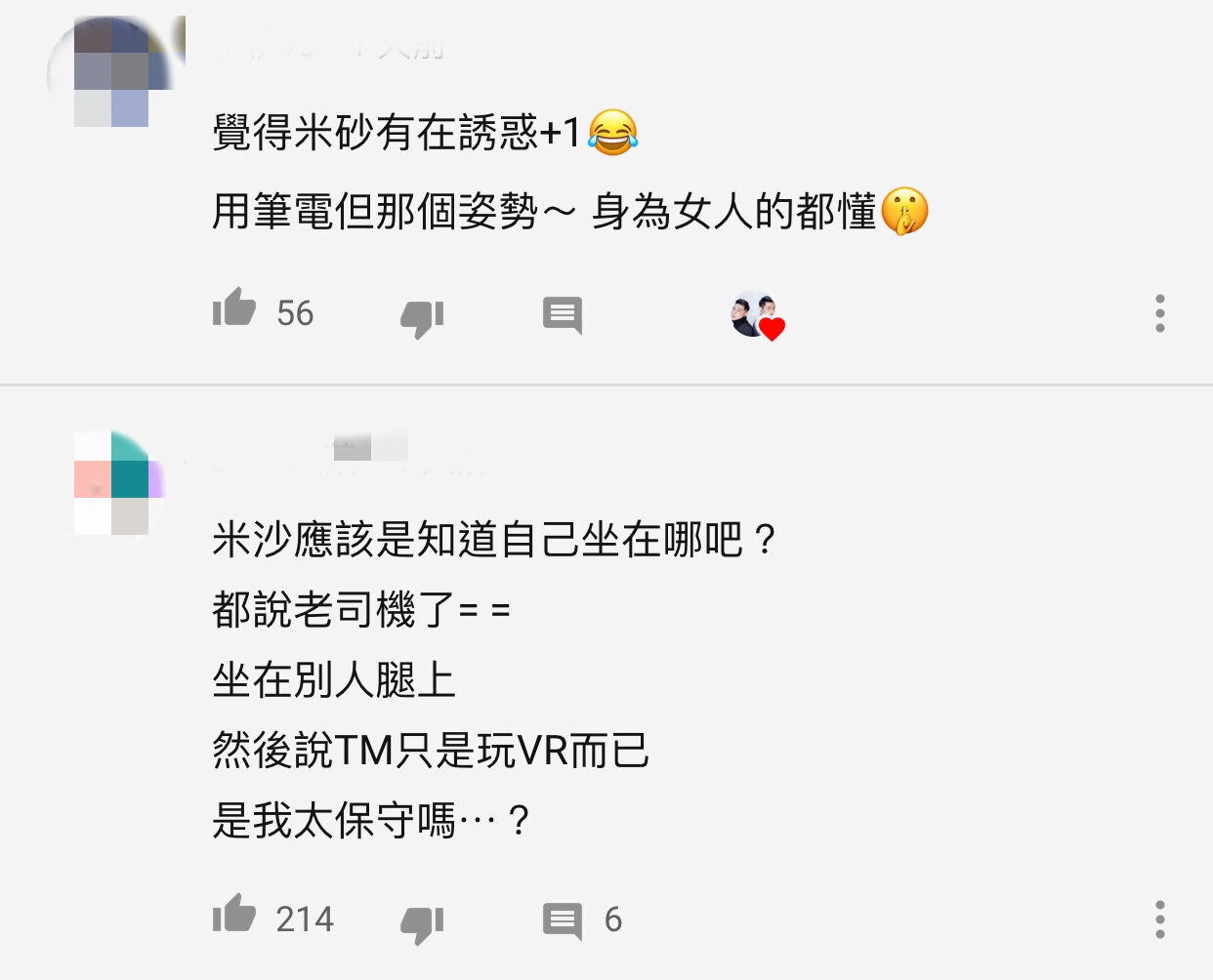 瘋男於6日上傳此影片,許多網友對於米砂的行為紛紛留言表示,「那女的趴沙發弄影片的那姿勢,不是故意在誘惑晨灰嗎??」、「米砂完全沒拒絕欸.....老司機坐在男人腿上會不知道?以為坐沙發?」、「覺得真的有在誘惑欸⋯」、「米砂斜躺用電腦感覺很故意色誘哦,哈哈」、「覺得米砂有在誘惑+1,用筆電但那個姿勢~身為女人的都懂」。