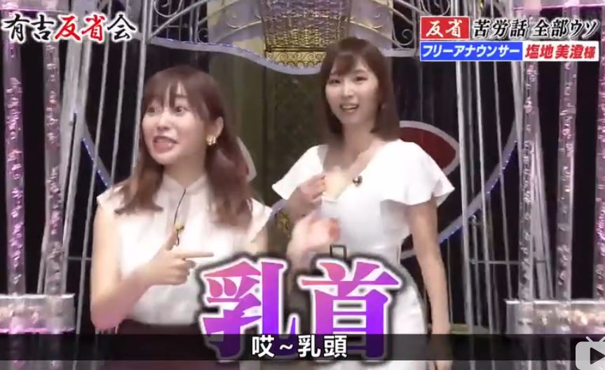 由日本電視台推出的綜藝節目《有吉反省會》,專找線上藝人坦承曾經對大眾說過的謊言並進行懲罰,近期一名由女主播轉戰寫真女星的鹽地美澄,靠著甜美外貌和G罩杯的傲人身材接下少寫真作品,不過節目中卻大喇喇表示沒穿內衣。鹽地美澄坦言因為「最近穿內衣肩膀會痛」所以平時都沒有穿,就連錄影當天身穿白色連身褲,鹽地美澄都沒穿胸罩甚至連胸貼都省了,為此節目固定班底指原莉乃還當場驗貨。