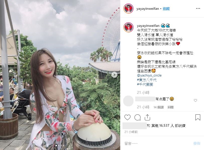 丫丫後來又一連分享多張當日拍的性感照,更打上:「今天玩了大概10次大海嘯,雙人滑水道 單人滑水道,好久沒有玩這麼過癮了哈哈哈,像個迎接暑假的快樂小孩」,而因為畫面過度養眼,許多網友也紛紛激動留言。
