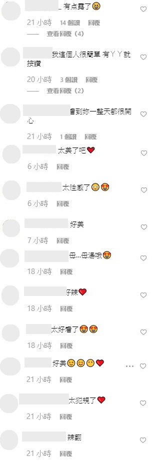 網友打上:「有點露了」、「我這個人很簡單 有ㄚㄚ就按讚」、「看到妳一整天都很開心」、「好美好辣好漂亮」、「美美的~」、「太美了吧」、「太性感了」、「小性感」、「福利滿滿」、「感覺超好玩欸」、「辣起來」、「母…母湯哦」,只能說夏天真的都是男粉絲的福利時間!