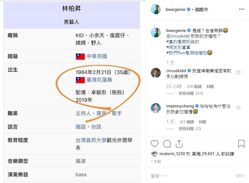 35歲的KID和和許維恩分手後,感情狀況一直沒有著落,今年4月中突然宣布入伍,而前女友許維恩也宣布認愛大馬師弟呂銳。沒想到日前熊熊突然在IG貼出維基百科的截圖,只見照片中是KID維基百科的資料,但配偶欄竟然寫著「熊熊(卓毓彤)」還註明兩人是2019年結婚,不僅讓粉絲們看了嚇壞,連她本人看了都嚇ㄧ跳。