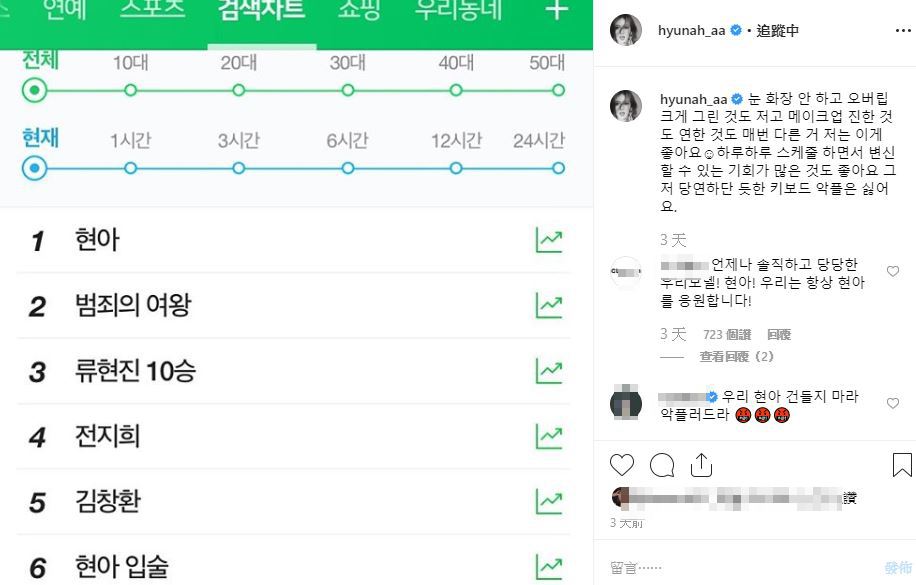 上周六(6日)泫雅受邀參與高雄音樂節,現身韓國仁川機場的他,身穿緊身藍色洋裝展現性感S曲線,不過臉上顯眼的紅唇卻再度掀起整容爭議,因而登上國內外新聞。對此,泫雅抵達台灣後就在個人IG截圖新聞畫面正面闢謠,文中指出「我沒有畫眼睛,也只是把嘴唇全塗、化得大一點」,接著也解釋平常化妝習慣並說到「我喜歡變化妝容,所以有時會很濃有時會比較淡,每天跑工作行程可以有很多變身的機會很好,這很理所當然。討厭酸鍵盤俠的評論」!