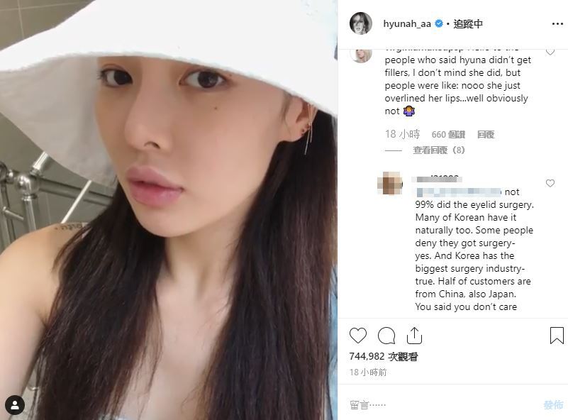 韓國性感小野馬泫雅因為擁有姣好外貌和身材,出道以來始終陷入整容疑雲,甚至曾經拍片保證「臉上絕對沒有填充物」,但沒想到近期因為換了妝容,卻被網友質疑「嘴唇打玻尿酸」甚至數度登上國內外新聞版面,5日,泫雅再PO文表示「只是嘴唇全塗」。8日,泫雅IG公開刻意近拍「裸唇」的照片,疑似想破除謠言,卻再度被網友砲轟「就堂堂正正說有整就好了啊」。