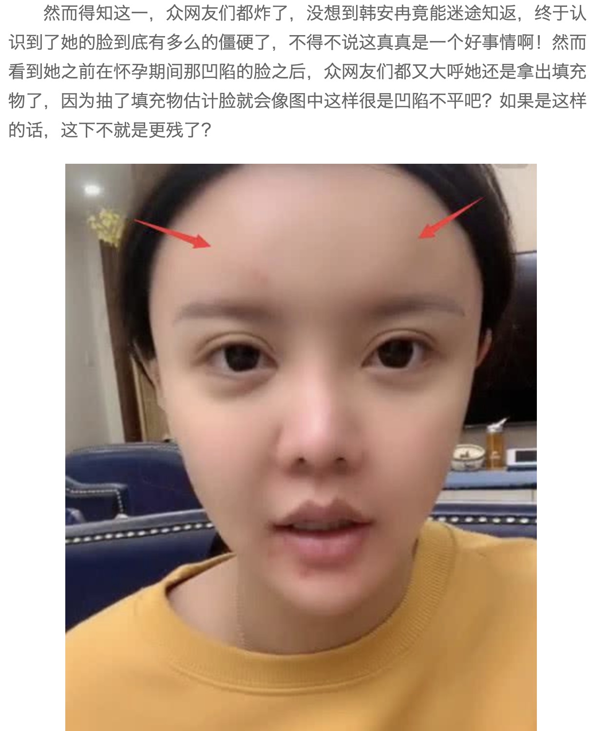 過去韓安冉從16歲就開始迷上整形,而她也時常前往韓國整形,6號時她在微博上發文寫下:「我小時候真是畸形審美啊把臉整那麼假,昨天手術好了,我把額頭和太陽穴填充的脂肪全部抽了!鼻子也做自然了!臉因為填充脂肪太多導致下垂也提升上去了」,更提到現在整形都是因為小時候可怕的審美觀造的孽,更勸大家整形一定要自然,不然真的會很醜,過去韓安冉的鼻子非常的堅挺,且額頭的地方也有很明顯的填充感,看上去有些不自然。而看見韓安冉發文表示自己把填充物拿掉以及鼻子重做之後,網友也紛紛留言表示終於願意重做了,過去的樣子真的非常不自然。