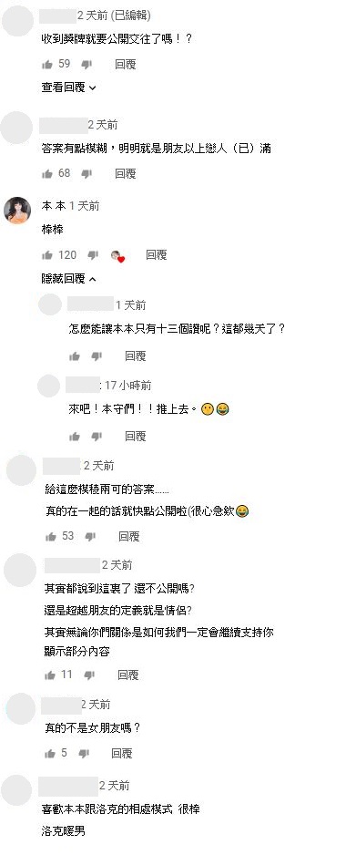 影片播出之後,網友也紛紛留言:「收到獎牌就要公開交往了嗎!?」、「答案有點模糊,明明就是朋友以上戀人(已)滿」、「給這麼模稜兩可的答案…… 真的在一起的話就快點公開啦(很心急欸」、「其實都說到這裏了 還不公開嗎?」、「真的不是女朋友嗎?」,而女主角本本也留言:「棒棒」,引起粉絲關注!