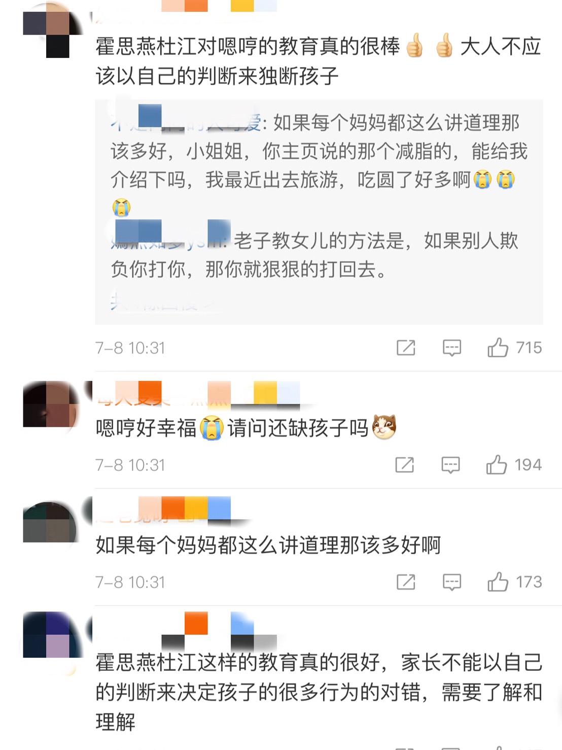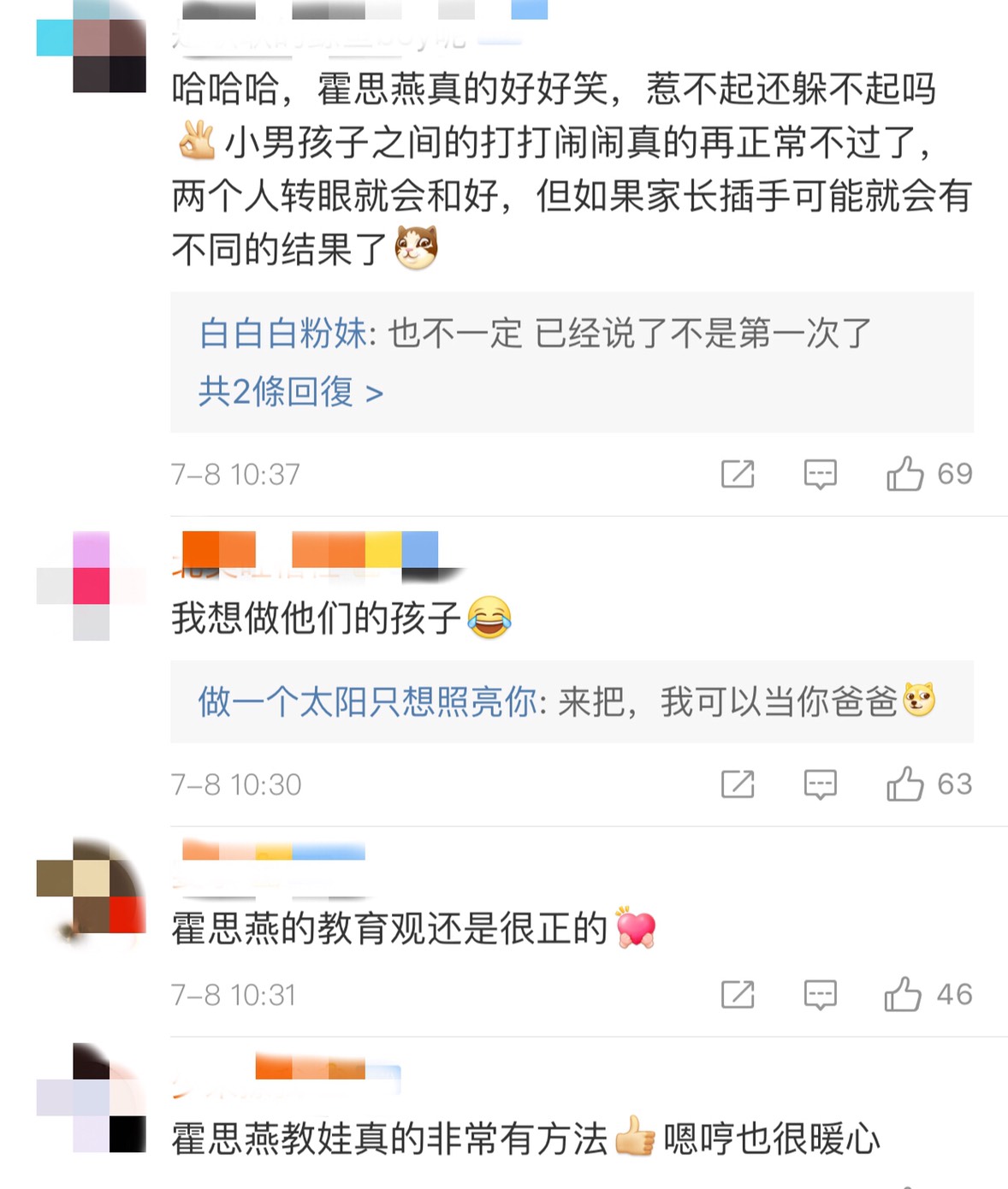 如果嗯哼被欺負的問題一直沒能徹底解決,霍思燕會考慮讓小孩轉校,她無奈表示,「惹不起還躲不起嗎」。對於霍思燕的教育觀,獲得網友一致好評,「霍思燕杜江對嗯哼的教育真的很棒,大人不應該以自己的判斷來獨斷孩子」、「如果每個媽媽都這麼講道理那該多好啊」、「小男孩子之間的打打鬧鬧真的在正常不過了,兩個人轉眼就會和好,但如果家長插手可能就會有不同結果了」。