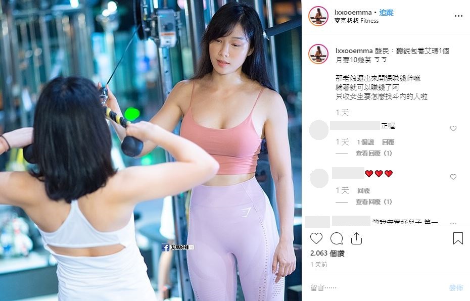 艾瑪過去是成吉思汗健身俱樂部的員工,後來也曾在健身工廠任職,現在則為自由教練。今年二月時,她因為在自己的YouTube頻道「Hot Emma」中提到過去的工作,而和館長槓上,一時蔚為話題。而說話風格嗆辣的她,近日被酸民指出被包養一個月10萬元,她也特別在IG中發文回應!