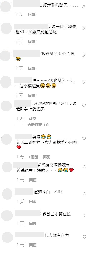 而粉絲見狀後,也紛紛留言:「笑爛??艾瑪正到翻掉~女人都搶著抖內啦」、「好想上課!」、「靠自己才實在」、「代表妳有實力」、「好無聊的酸民」、「艾瑪一個月隨便也30,10幾只能包個屁」、「哇~~~10幾萬ㄟ,比一個小模還貴」,引起許多討論。