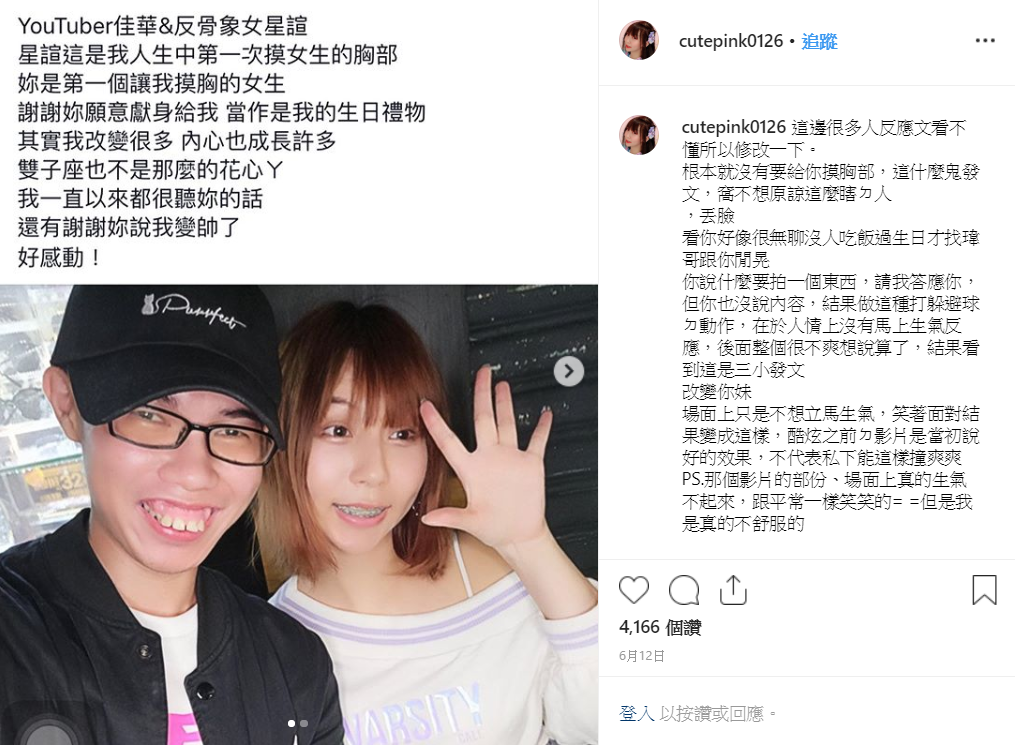 「孫安佐」是藝人狄鶯和孫鵬的獨生子,去年因在美國涉恐怖威脅罪被捕,關押9個月後返台,展開新生活的他如今搖身一變成為Youtuber,並時常在頻道分享動漫、健身影片,目前頻道已有24萬訂閱。孫安佐在6日發布新片,內容是和象女「星諠」當一日情侶,兩人在影片中大放閃的樣子被網友調侃:「佳華已哭暈在廁所」!