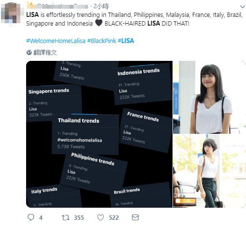 女團BLACKPINK今年除以新專輯《Kill This Love》回歸,同時也展開世界巡迴演唱會「IN YOUR AREA」目前演唱會已經進入最後階段剩下日本場,而本周12至14日將在泰國曼谷舉辦安可場,其中10日一早,泰籍成員Lisa則搶先現身韓國仁川機場準備搭機返鄉,此次以銀灰髮色回歸的Lisa,突然以全新的一頭黑髮亮相,且穿著簡單的白衣搭配喇叭西裝褲,不僅更加凸顯洋娃娃的五官,一雙大長腿也格外引人注目,機場照就成為韓國和外網包括東南亞地區、南美和歐洲網站的熱搜人物。