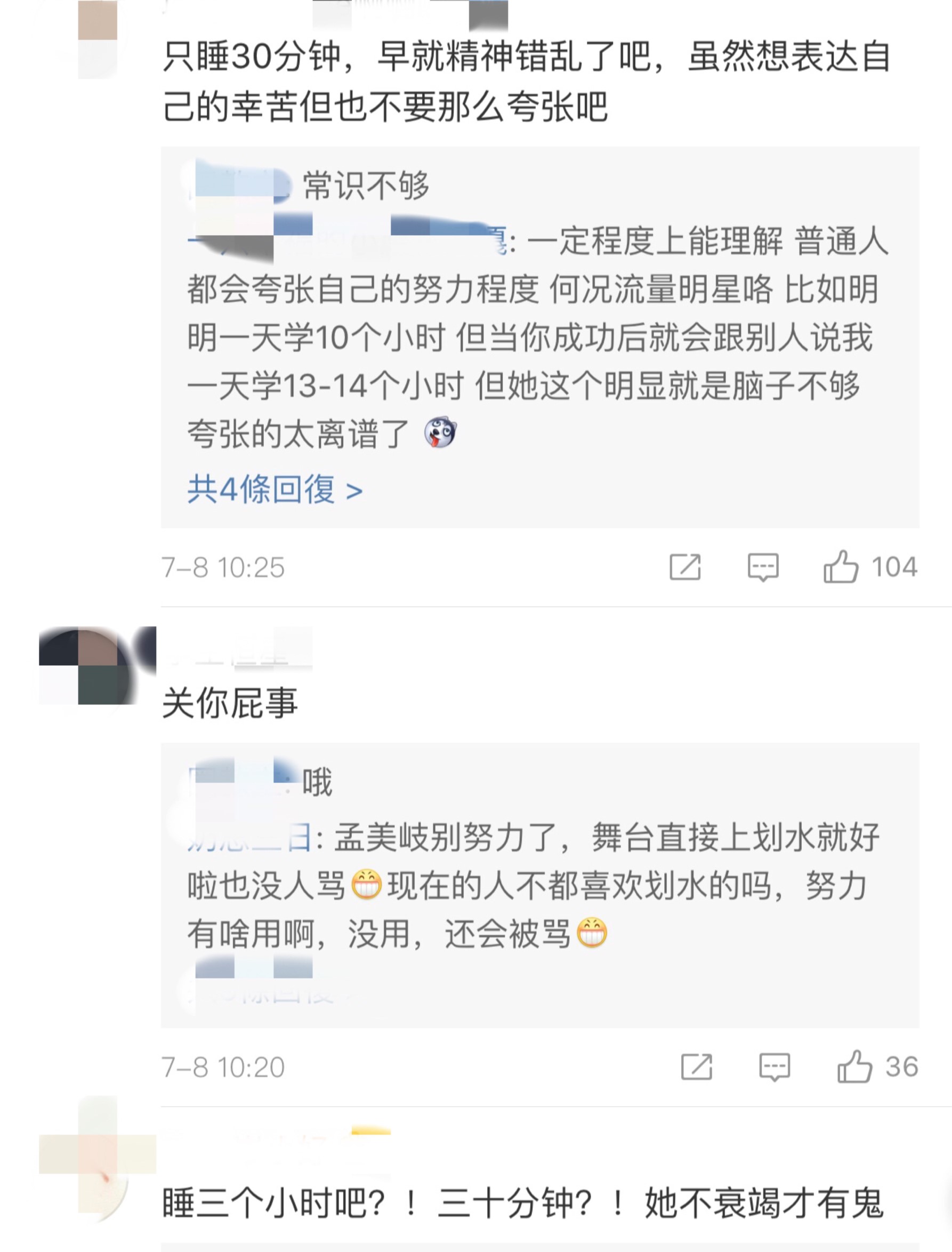 在最新一期的節目中,孟美岐為了證明自己的努力,在和學員交流過去比賽經歷時說到,「比賽一共三個月,後面的兩個月,我幾乎每天要麼不睡覺,要麼只睡30分鐘」,此番言論引來許多網友吐槽,質疑太誇張無法相信,「只睡30分鐘,早就精神錯亂了吧,雖然想表達自己的辛苦,但也不要那麼誇張吧」、「睡三個小時吧?!三十分鐘?!她不衰竭才有鬼」,甚至有網友建議孟美岐去申請金氏世界紀錄,世界紀錄是11天不睡覺。