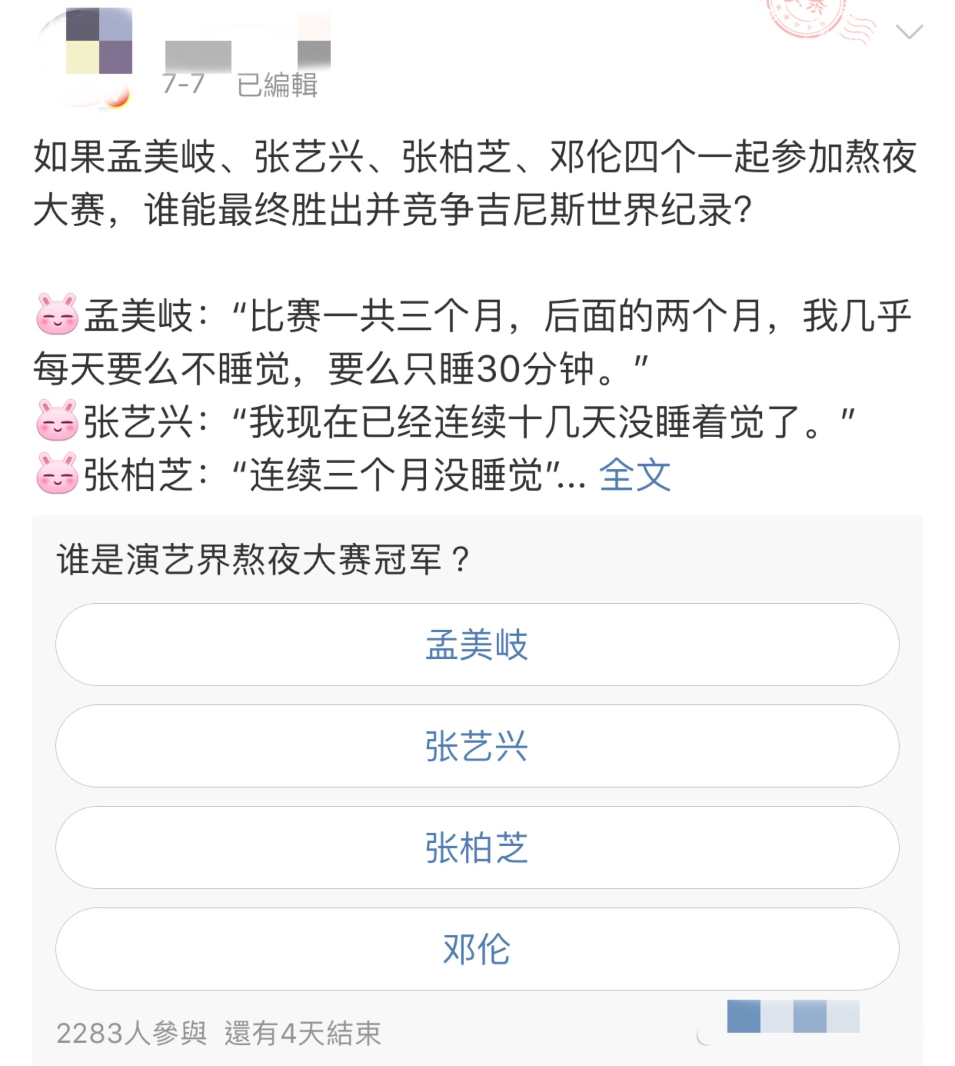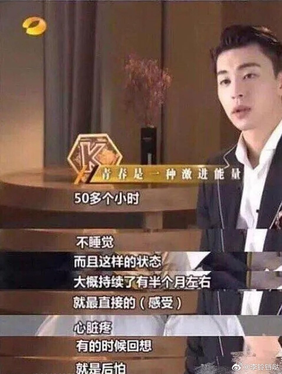 過去藝人張藝興在受訪時曾表示,「我已經連續十天沒睡著覺了」;女星張柏芝在節目上也提到,「因瘋狂拍戲連續3個月沒有睡覺」;鄧倫也說過,「50多個小時不睡覺,持續了半個月左右」,甚至有網友開玩笑的在微博上開了投票:「張藝興、張柏芝、鄧倫、孟美岐,誰是演藝界熬夜大賽冠軍?」,十分諷刺。