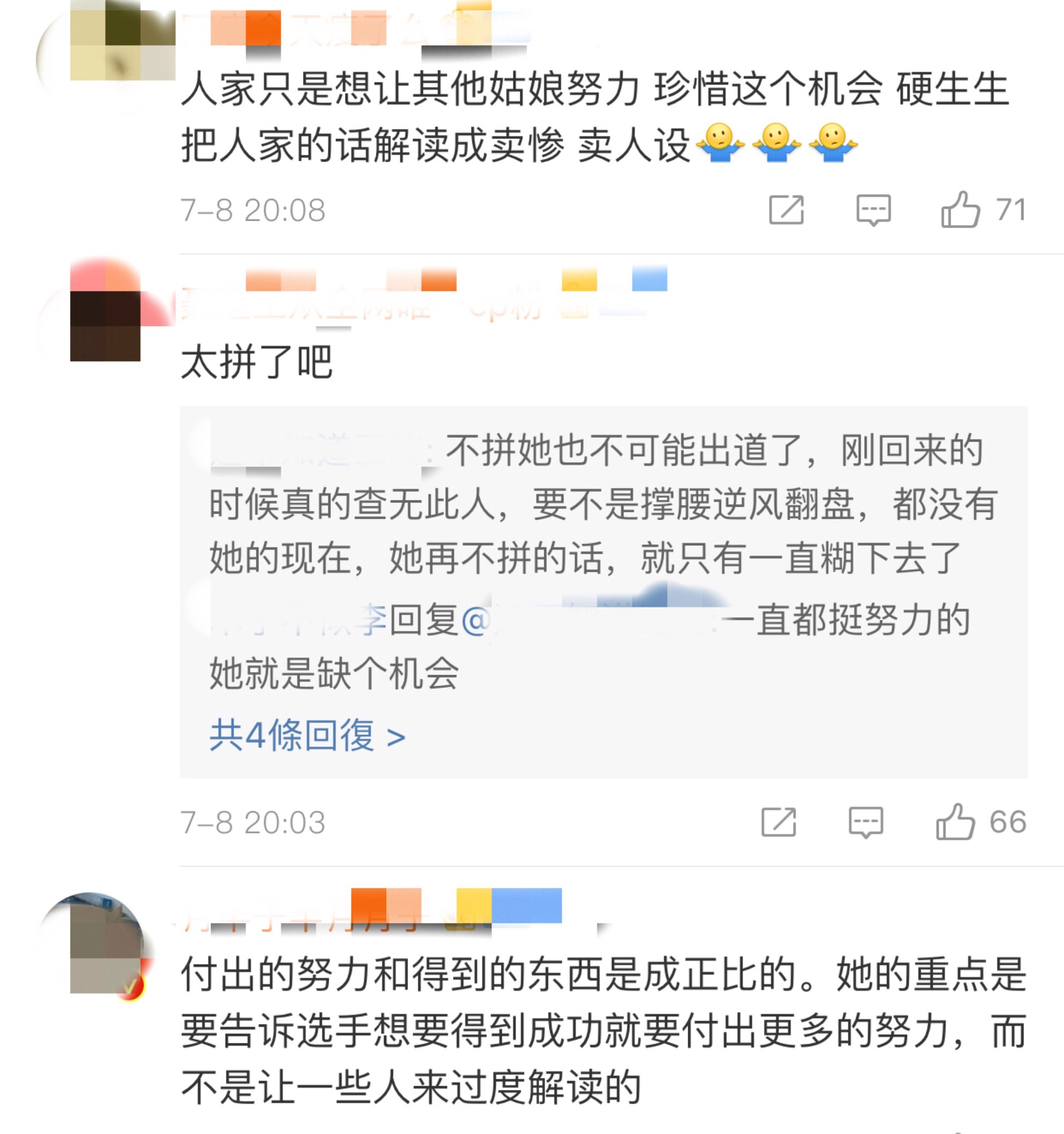 也有網友表示大家過度解讀孟美岐的話,孟美岐的本意是想告訴大家在比賽中要抓住每個機會,傳遞努力不放棄的價值觀,就如同孟美岐一直以來秉持的「不忘初心」以及「敬畏心」,但大家關注錯了重點。之後孟美岐也提到比賽的整個過程,她是非常幸福、非常開心的,她永遠也不會忘記最開始熱愛的東西是什麼。