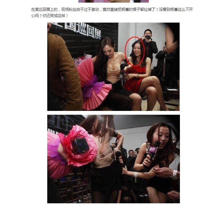 楊冪過去出席一場巡迴活動時,穿著杏色深V低胸洋裝,胸前渾圓呼之欲出,展現超深的事業線,當時粉絲能和楊冪近距離互動,但卻有一位粉絲太激動,手一拉直接扯下楊冪的洋裝,只見洋裝被扯到腰間,不僅讓她的內衣外露,胸部也全被看光光,她只能一臉鐵青,尷尬得趕緊將裙子往上拉,但攝影師已經拍下這震撼的一幕。