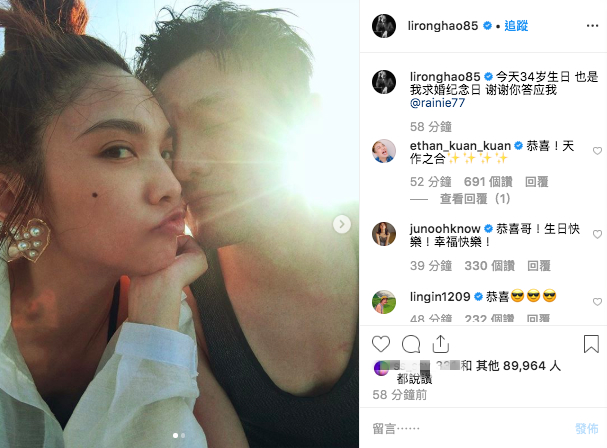 看到這,這對可愛俏皮、老是不按牌理出牌的戀人,似乎永遠知道如何帶給粉絲驚喜,因為就在女方PO文後,李榮浩隨即也於IG宣布求婚成功,寫道「今天34歲生日,也是我求婚纪念日,謝謝你答應我」,並附上和楊丞琳臉貼臉超幸福合照,以及爆大顆求婚鑽戒,宣告5年熱戀修成正果,濃情互動瞬間閃瞎粉絲雙眼。