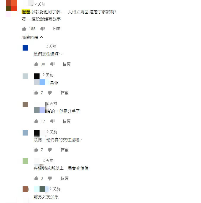 許多不知情的網友好奇發問:「愷愷大根交往過?」也有人察覺:「愷愷:以我對他的了解…大根立馬回:這麼了解我啊?嗯…這段對話有故事。」不少網友透露:「沒錯!他們真的交往過」、「前男女友關係」、「難道這就是所謂的相愛相殺嗎?」、「大根跟愷愷在一起過不是嗎?」