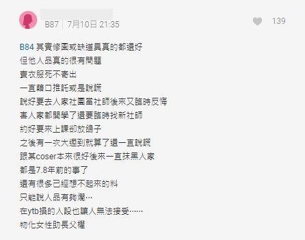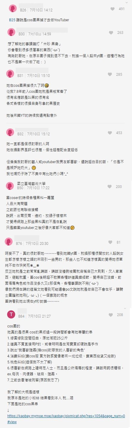 而文章發布後,也引起其他網友留言討論,更有不少網友提到過去米砂過去待在cos圈的事,「聽說是cos圈黑掉才去做YouTuber」、「有夠討厭她,在原本圈子搞到混不下去,就換一個人設來yt圈,這種行為她也不是第一次做了啦」、「從我7.8年前入cos圈她就是黑板常客了,很有名應該是叫黑得很有名」、「她在攝影界風評也很差,個性超差配合度超低」、「當coser的時候各種黑料一籮筐,人品大有問題,之前跟他有聯絡接觸,說謊、出爾反爾、違約、放鴿子樣樣來」。
