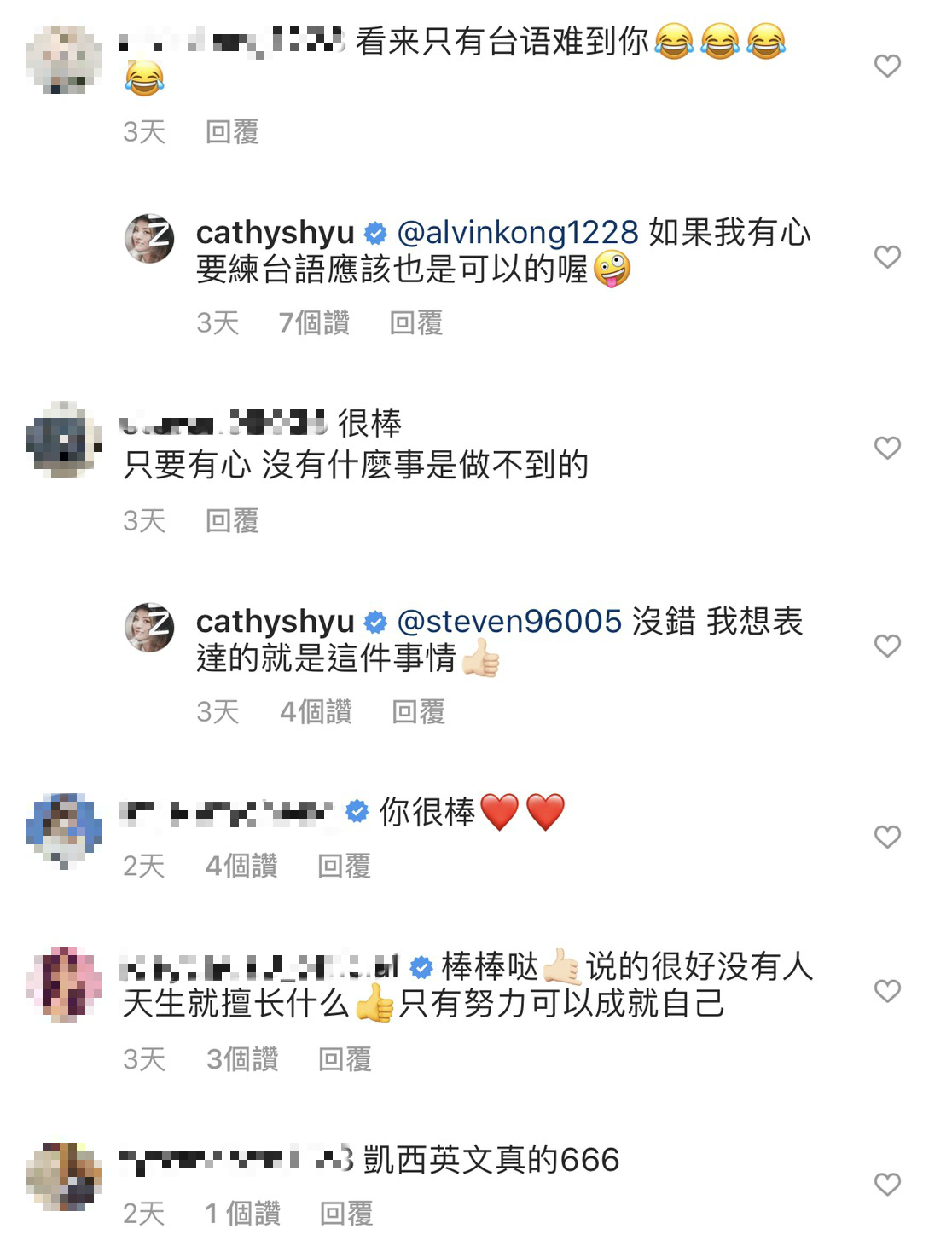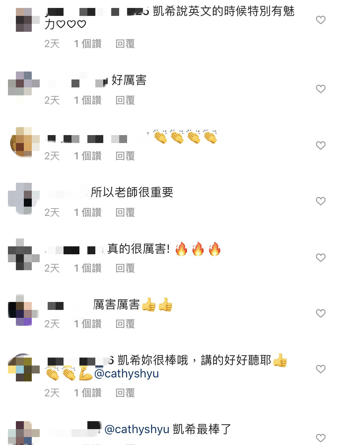 直到國二,凱希遇到了一位教學方式非常有趣的英文老師,讓她開始對英文產生很大的熱情;高二時又遇到一位優秀的英文老師,她會在上課時搞懂問題,並看許多課外讀物補充自己的單字量。網友看完凱希學英文的經驗後表示,「很棒,只要有心,沒有什麼事是做不到的」、「所以老師真的很重要」、「凱希你很棒哦,講的好好聽耶」,還有網友開玩笑,「希望娛百狼人殺你的發言也可以用英文講」。