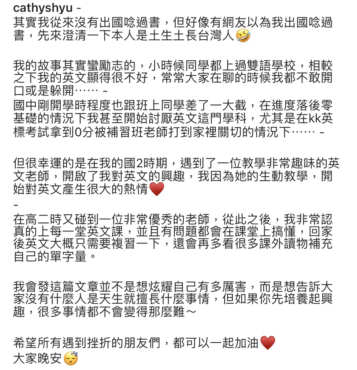 從一個討厭英文的人到對學英文很有熱情,凱希也勉勵大家,「沒有什麼人是天生就擅長什麼事情,但如果你先培養起興趣,很多事情都不會變得那麼難~」。