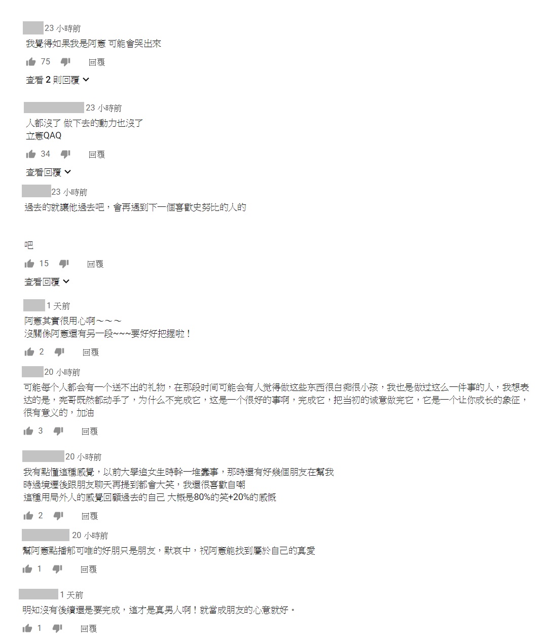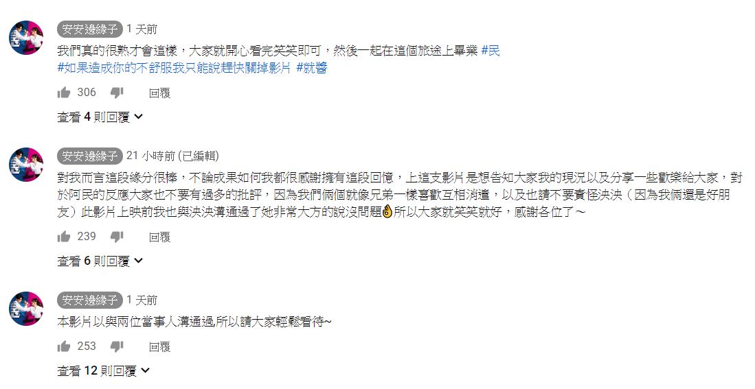 而在影片下方阿憲更留言吐露心聲「對我而言這段緣分很棒,不論成果如何我都很感謝擁有這段回憶」,並呼籲大家切勿批評阿民和責難泱泱,展現出良好的男人風度,而網友們也紛紛留言表示「人都沒了 做下去的動力也沒了」「阿憲其實很用心啊~」「祝阿憲能找到屬於自己的真愛」。