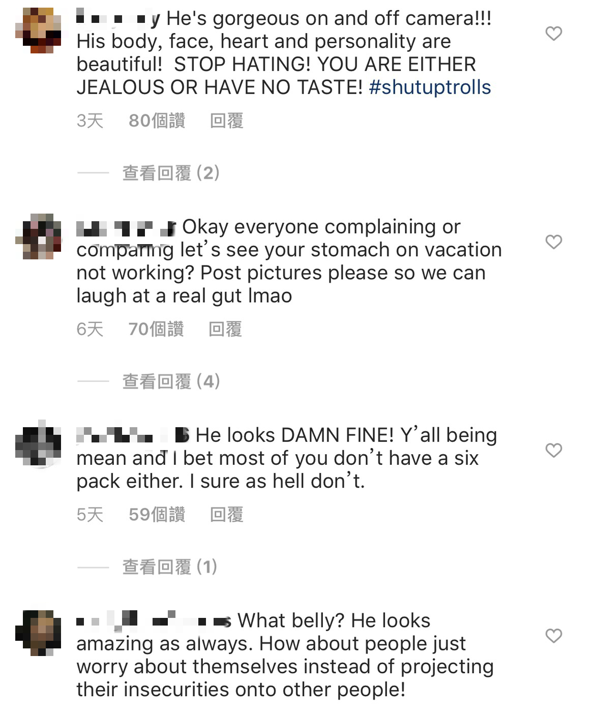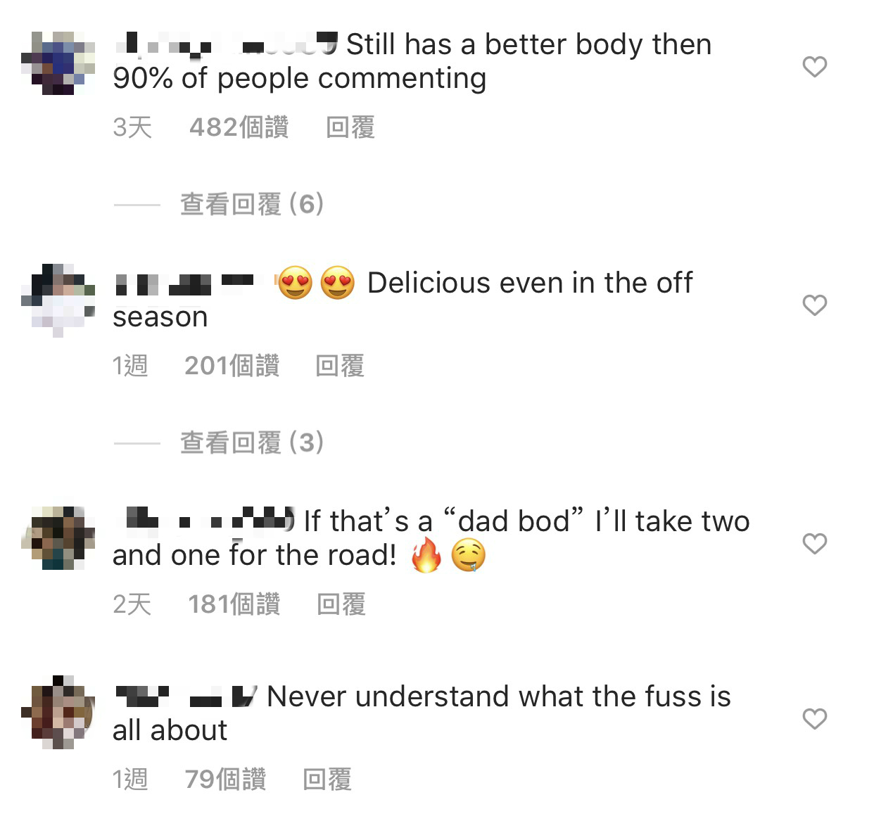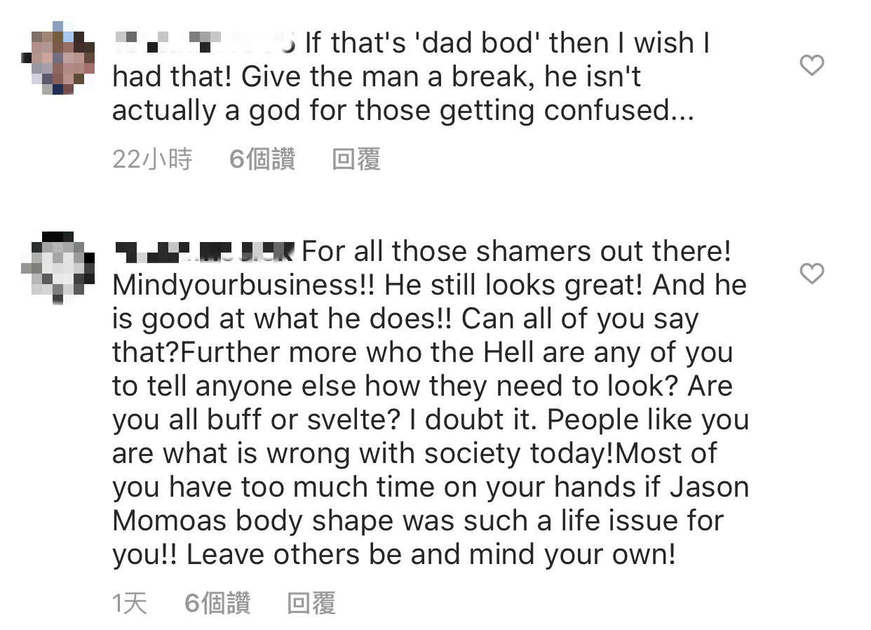 但仍有許多網友留言稱讚他和力挺他,「仍比90%評論者更好的身材」、「如果這是老爸身材我希望我也有,讓這個男人休息一下」、「對我來說看起來仍然很完美」、「有些人很無聊評論這些愚蠢的事情,我倒想看看他們的身材如何」,也有網友表示那些惡意評論者只是忌妒傑森摩莫亞的好身材。