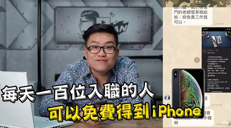 而持續了解之後,九妹也形容「他們像老鼠會的模式要你一直打廣告」,解釋網友常常在各大粉絲團看見打字徵人的訊息,就是因為他們會要求應徵的人幫忙打廣告,另外還加碼宣布每一百位求職者可以得到iphone,詐騙的嫌疑越來越大。