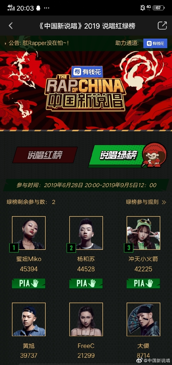 《中國新說唱》第二季除了賽制上有許多更動之外,還額外多了一個投票榜,在榜中分為紅榜(支持)與綠榜(討厭),網友每一天都能夠進入網站投票,而榜單的統計從6月28日到8月18日截止,官方微博在11號晚間發出一張綠榜的截圖,其中第一名的選手變成了蜜妞,領先第二名的楊和蘇約1000票,然而蜜妞本人也在該則貼文下方留言回應:「非要這麼說嗎?我覺得你們都有點毛病 我...四集鏡頭沒有第一季一集的多......我還能拿第一?我也不知道是笑還是哭」,許多網友也非常認同這次投票的排名。