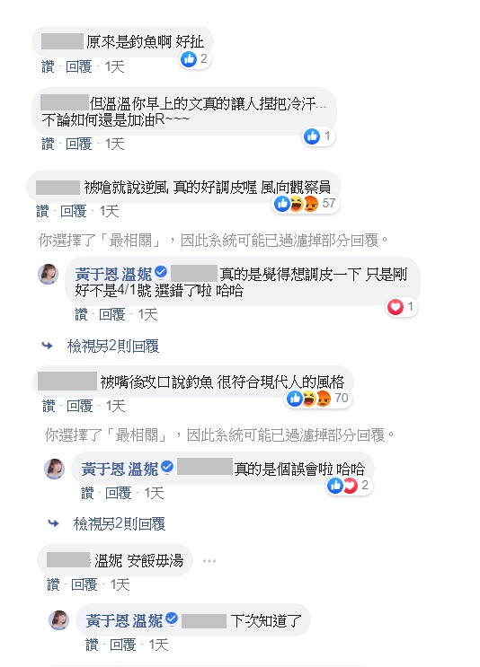儘管如此,但「溫妮」的這個行為似乎惹怒了許多網友,令不少網友完全不買單「溫妮」的說法,紛紛留言表示「原來是釣魚啊 好扯」「被嗆就說逆風 真的好調皮喔 風向觀察員」「被嘴後改口說釣魚 很符合現代人的風格」。
