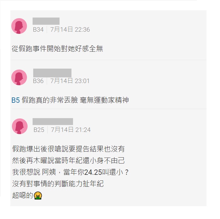 之後,「溫妮」的貼文更被人轉貼至DCARD,引發更多的議論,而且過去「溫妮」的「假跑事件」又再次被重提,網友更直嗆「從假跑事件開始對她好感全無」「假跑真的非常丟臉 毫無運動家精神」,更針對「溫妮」先前對於「假跑事件」所做的澄清進行批評撻伐,直指「溫妮」牽拖自己當年年紀小,怒嗆「超噁的」。
