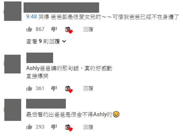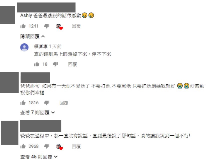 提親影片一出來,許多網友被Ashly爸爸的一番話給感動,紛紛留言:「Ashly 爸爸最後説的話很感動」、「爸爸在過程中,都一直沒有說話,直到最後說了那句話,真的讓我哭到一個不行」、「Ashly爸爸講的那句話直接爆哭」直接被戳到淚點。