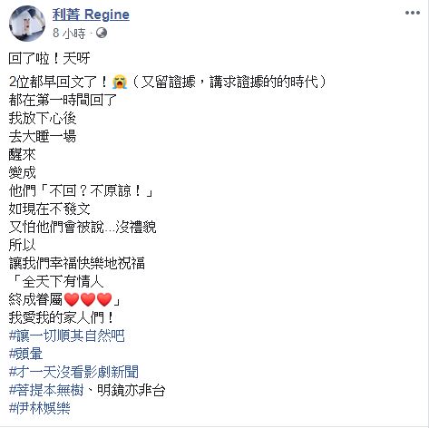 利菁透露,之所以想公開他們的私訊對話,是擔心外界誤會孫協志和夏宇童「不回?不原諒!」沒禮貌,「所以讓我們幸福快樂地祝福『全天下有情人終成眷屬』,我愛我的家人們!」
