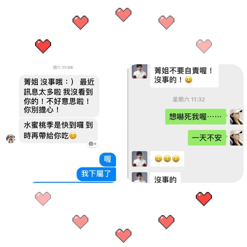 不久後她才知道根本是誤會一場,趕緊私訊兩人道歉,但一直沒有等到兩人的回覆,讓她緊張直說:「都沒有回我…」利菁心情忐忑了好幾天,今(15)日終於在臉書PO出對話私訊,孫協志告訴她:「菁姐不要自責喔!沒事的!」利菁才鬆了一口氣:「嚇死我喔…一天不安」。而夏宇童也在同個時間回覆:「菁姐沒事哦:)最近訊息太多啦,我沒看到妳的!不好意思啦!妳別擔心!」甚至還說要帶水蜜桃給她吃,才終於讓利菁放下心中的大石頭。