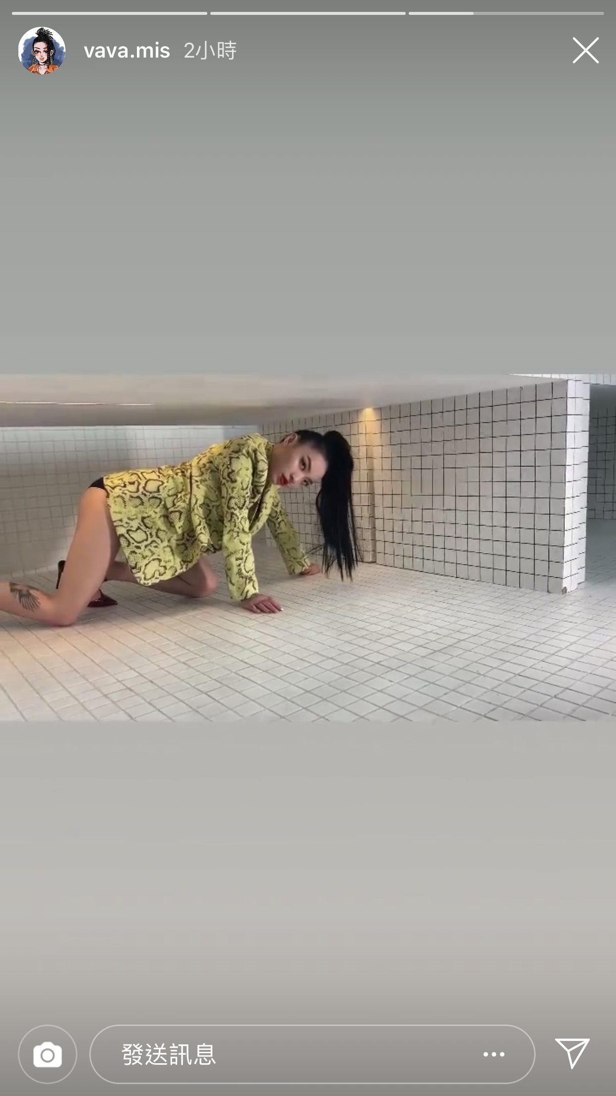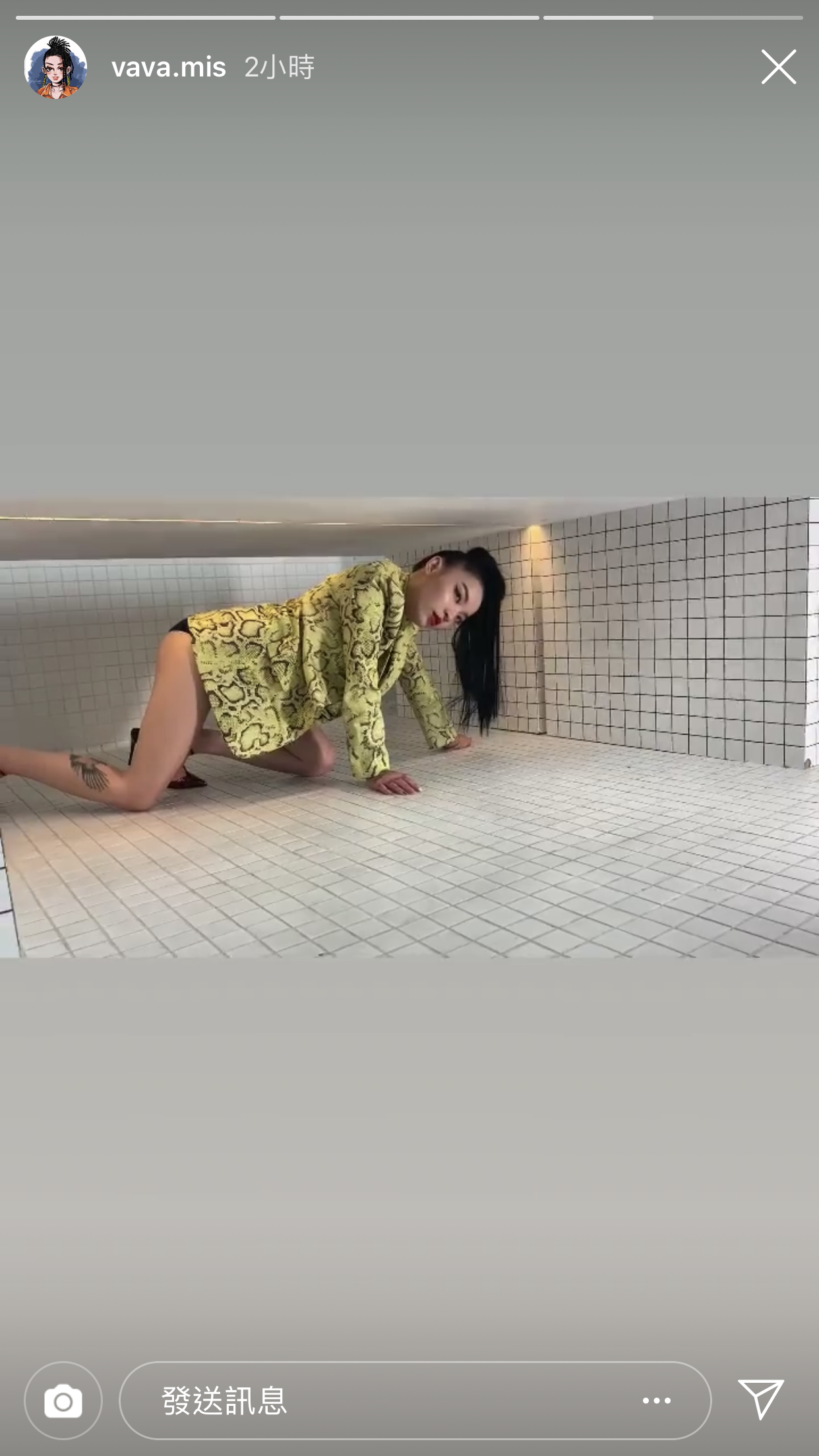 VAVA在本週末(14號)時在IG限時動態上發出一則側拍的影片,而在影片中VAVA身穿一件黃色且有蛇紋圖騰的外套,下半身僅穿了一件黑色的內褲,在影片中VAVA的姿勢也相當引人遐想,她在一個充滿白色磁磚的空間中,並以跪著的姿勢進行拍攝,纖細火辣的長腿一覽無遺。在12號時,VAVA也在IG上更新一張照片,照片中她坐在一張白色的桌子上,雙手向後撐著,而她身穿一件牛仔短褲再次展露出纖細的長腿。