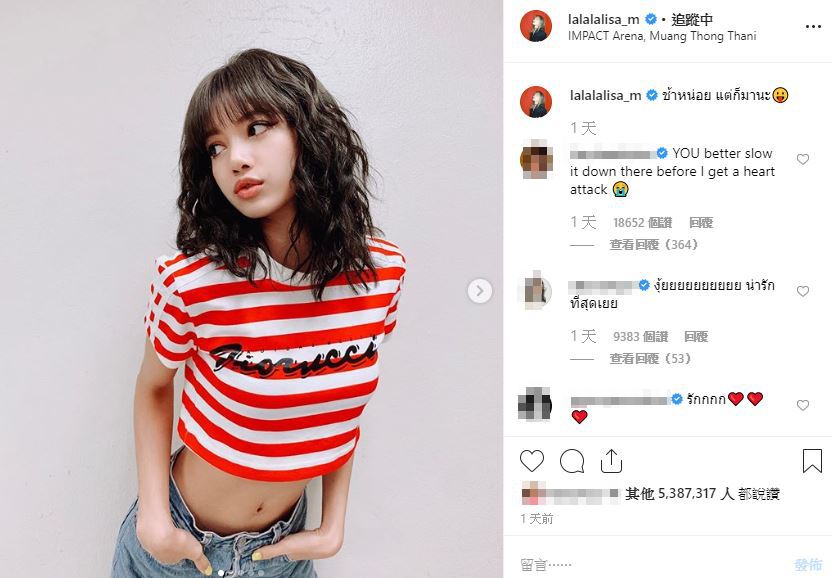 女團BLACKPINK 4成員各自都擁以超高人氣,其中泰籍成員Lisa去年6月開通IG帳號,在韓國女星的追蹤人數中今年1月,就已經成功打敗前被少女時代成員太妍的紀錄。14日,Lisa一組半身照更成為韓星史上貼文最高按讚數,照片中,Lisa身穿短版上衣,雙手還抬高到後腦勺,大方露出肚臍和螞蟻細腰,才公開21小時就已經突破500萬人按讚,更引起大批網友驚呼「21小時就5百萬他是第一個」、「挖真的很不可思議」、「這個造型太適合了」。