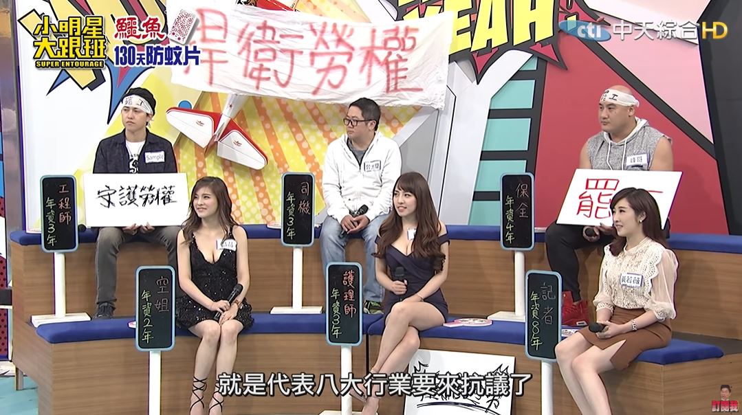 晶晶在節目上大聊她的空姐秘辛,不僅如此,也不吝嗇秀出她的好身材,只見晶晶穿著一件黑色亮片連身裙,胸前超深V的設計,讓她豐滿的上圍幾乎有3分之2都露在外面,擠出超深事業線,邊講話酥胸還跟著輕晃,連吳宗憲看了都忍不住開玩笑說:「第一位就是代表八大行業要來抗議了!」更調侃說:「你空姐有必要穿這麼露嗎!?」
