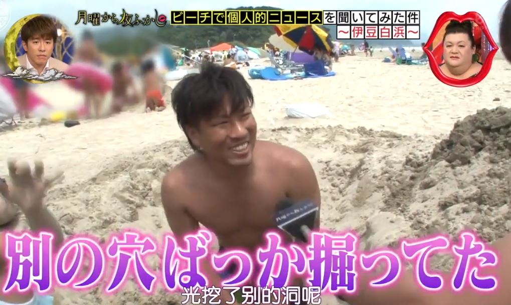 節目組也注意到一組家人遊客,由於爸爸在沙灘上挖出了深達膝蓋的大洞,引起工作人員好奇。對此,爸爸則暖心解釋「就是想讓孩子開心嘛」,然而女兒卻當面打臉「真的很無聊」,事實上該名父親10年前同樣也以「搭訕」目的來到白濱,不過節目組詢問當時也有挖洞嗎,爸爸竟大開黃腔表示「挖了別的洞呢」。