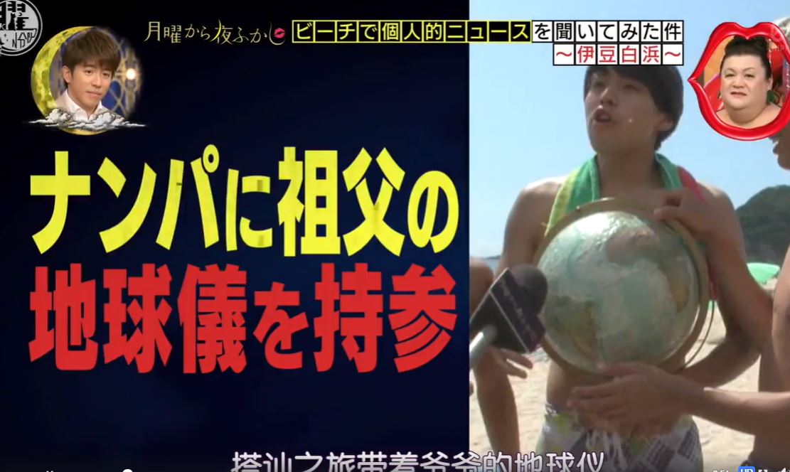 日本電視台推出的綜藝《月曜夜未央》(月曜から夜ふかし),最新播出的節目中到日本伊豆的白濱海灘出外景,希望親眼見證當地人口中「輕浮海灘」的各種怪象。節目從早上9時開始拍攝,一開始就遇到不少以「搭訕」為名來海邊的人,包括有人手拿地球儀打算開玩笑,甚至有桌球健將身穿紅色內褲並在重要部位掛了一大串鈴鐺,該路人解釋「想讓人發笑」。