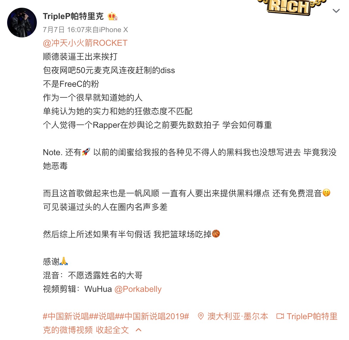 沖天小火箭在7月1號時發文表示FreeC在背後不斷謾罵、造謠,小火箭甚至還寫了一首歌Diss FreeC,而這首歌名叫《K.F.C》用雙關的方式表示:Kill Free C,裡面的歌詞也非常嗆辣寫道:「真正的Rapper不會抄襲」、「像個縮頭烏龜唱得這麼爛」,砲火非常猛烈。但是在7月7號和9號時有一位Rapper「TripleP」分別寫了兩首歌dissback沖天小火箭,在發文時也寫下:「不是FreeC的粉,作為一個很早就知道她的人,單純認為她的實力和她的狂傲態度不匹配,個人覺得一個Rapper在炒輿論之前要先數數拍子、學會如何尊重」