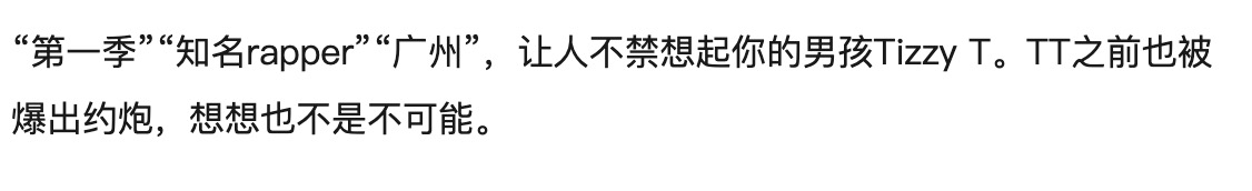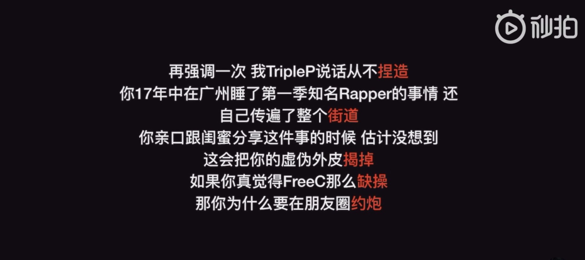 而TripleP在第二首dissback的歌曲裡面提到:「再一次強調我TripleP說話從不捏造,你(沖天小火箭)17年在廣州睡了第一季知名Rapper的事情還自己傳遍了整個街道」、「你(沖天小火箭)親口跟閨蜜分享這件事估計沒想到,我會把你虛偽的外皮揭掉」,然而網友對比裡面的線索指出小火箭約炮的對象應該就是暗指「Tizzy T」,過去TT也曾被爆出多次約炮的傳聞,令許多網友感到相當震驚。
