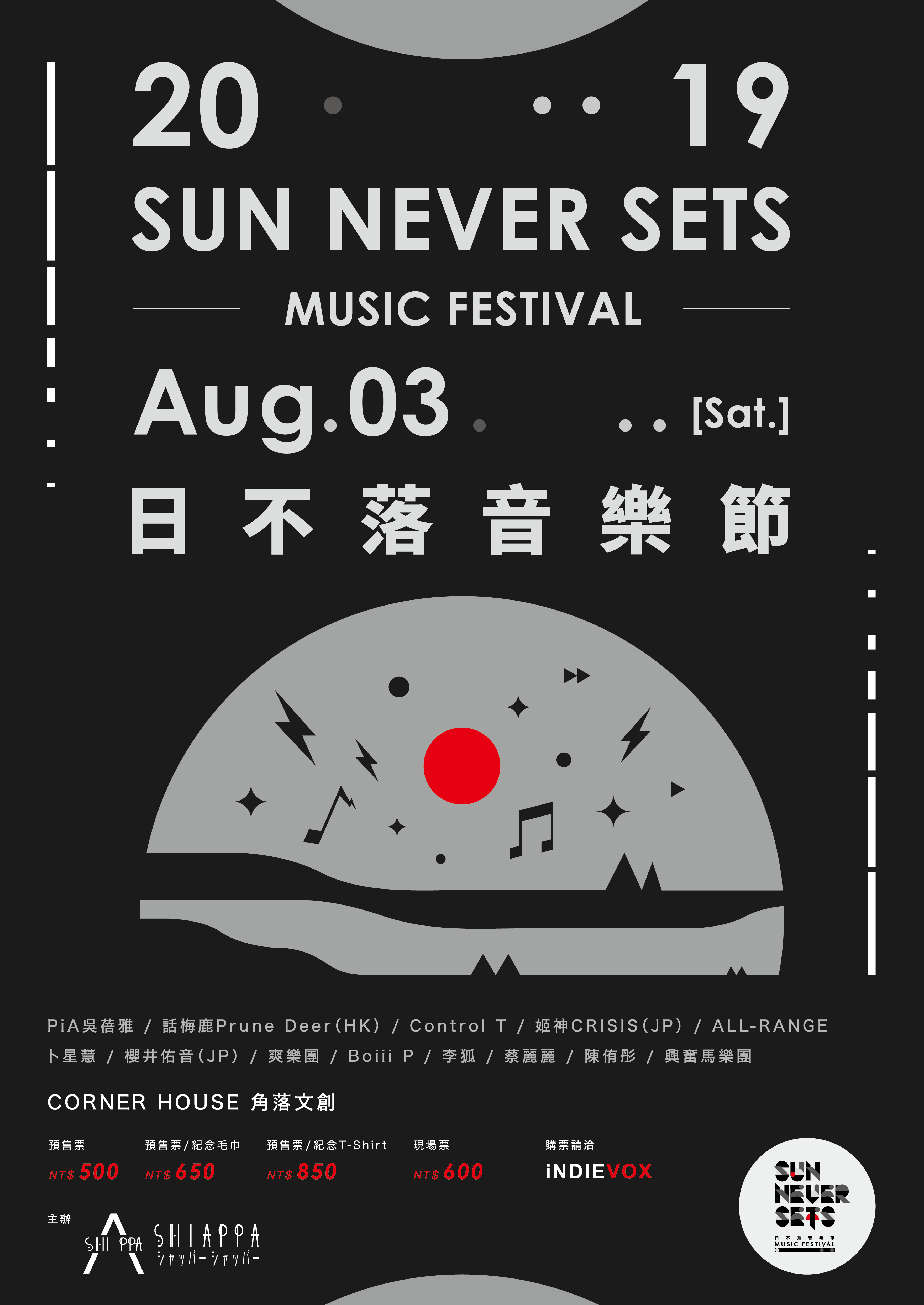 南拳媽媽師妹自然系女團「ALL-RANGE」,由華語樂壇知名製作人李天龍量身打造,為日不落音樂節帶來一股清新氣息。即將於8月13日發行新專輯「戀愛太危險」的澆花系創作歌手「PiA吳蓓雅」,這次將與弟弟的樂團「興奮馬樂團」同台演出!姐弟同台會帶來什麼樣的互動呢?蘇打綠團長阿福力推團體「Control T」,詞曲貼近人心的流動,樂句平易近人不過度華麗的包裝; 自彈自唱創作歌手「卜星慧」、前逆思樂團主唱及詞曲創作者「李狐」、帶來爽度破表音樂的「爽樂團」、台灣嘻哈R&B新一代創作新秀「Boiii P」、實力派彈唱歌手「陳侑彤」「蔡麗麗」都將在8月3日登上日不落音樂節的國際舞台!