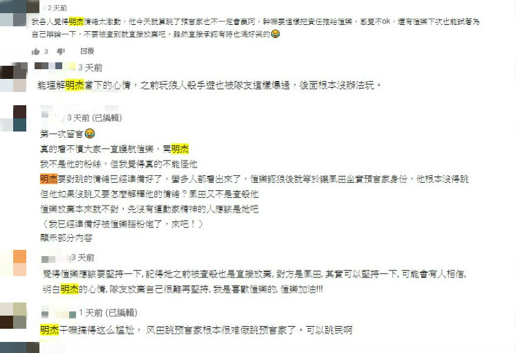 兩隻狼的舉動引起網友兩派論戰,有人認為明杰沒有運動家精神:「個人覺得明杰情緒太激動」、「明杰幹嘛搞得這麼尷尬!」、「得失心也太重了吧?」不過大多數網友認為,明明就是愷樂先提早放棄,弄到自己的狼隊友,「愷樂自爆那一刻就game over了」、「愷樂太早放棄了啦!讓明杰也玩不下去了」、「懂明杰心情,但明杰情緒也要控制一下,看得出來當下愷樂跟其他人都覺得很尷尬…」