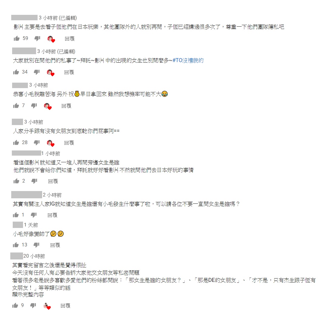 儘管如此,仍有許多網友好奇分手細節,讓力挺「小毛」態度的粉絲們紛紛留言表示「尊重一下他們團隊隱私吧」「大家就別在問他們的私事了~拜託~」「人家分手跟有沒有女朋友到底乾你們屁事阿」「小毛好像變帥了」。