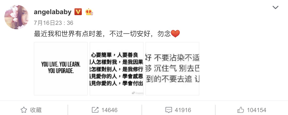 Angelababy在昨日晚間突然發文寫下:「最近我和世界有點時差,不過一切安好,勿念」,並配上三張心靈雞湯的文字圖分別寫著:「You live. You learn. You upgrade.」、「心要簡單,人要善良,別人怎樣對我,是我因果,我怎樣對別人,是我修行,遇見愛你的人,學會感恩,遇見你愛的人,學會付出。」,以及一張人生的建議與指引,突如其來發這類型的文也讓許多網友摸不著頭緒。