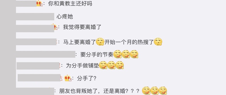 然而Angelababy這兩年來不斷被傳出婚變的傳言,許多網友也紛紛在底下留言:「妳和教主(黃曉明)還好嗎?」、「分手了?」、「朋友也背叛她了,還是離婚?」、「馬上要離婚了,開始一個月的熱搜了」、「為分手做鋪墊」、「我覺得要離婚了」。在前幾日也有網友翻出早期黃曉明和Angelababy結婚時女方疑似在飯局時被黃曉明的爸爸痛罵,甚至有出現抹淚的舉動,在近日兩人也紛紛被媒體拍到各自帶小海綿出遊,已經許久沒有兩人一起帶著小海綿出現了,婚變的傳言持續延燒。