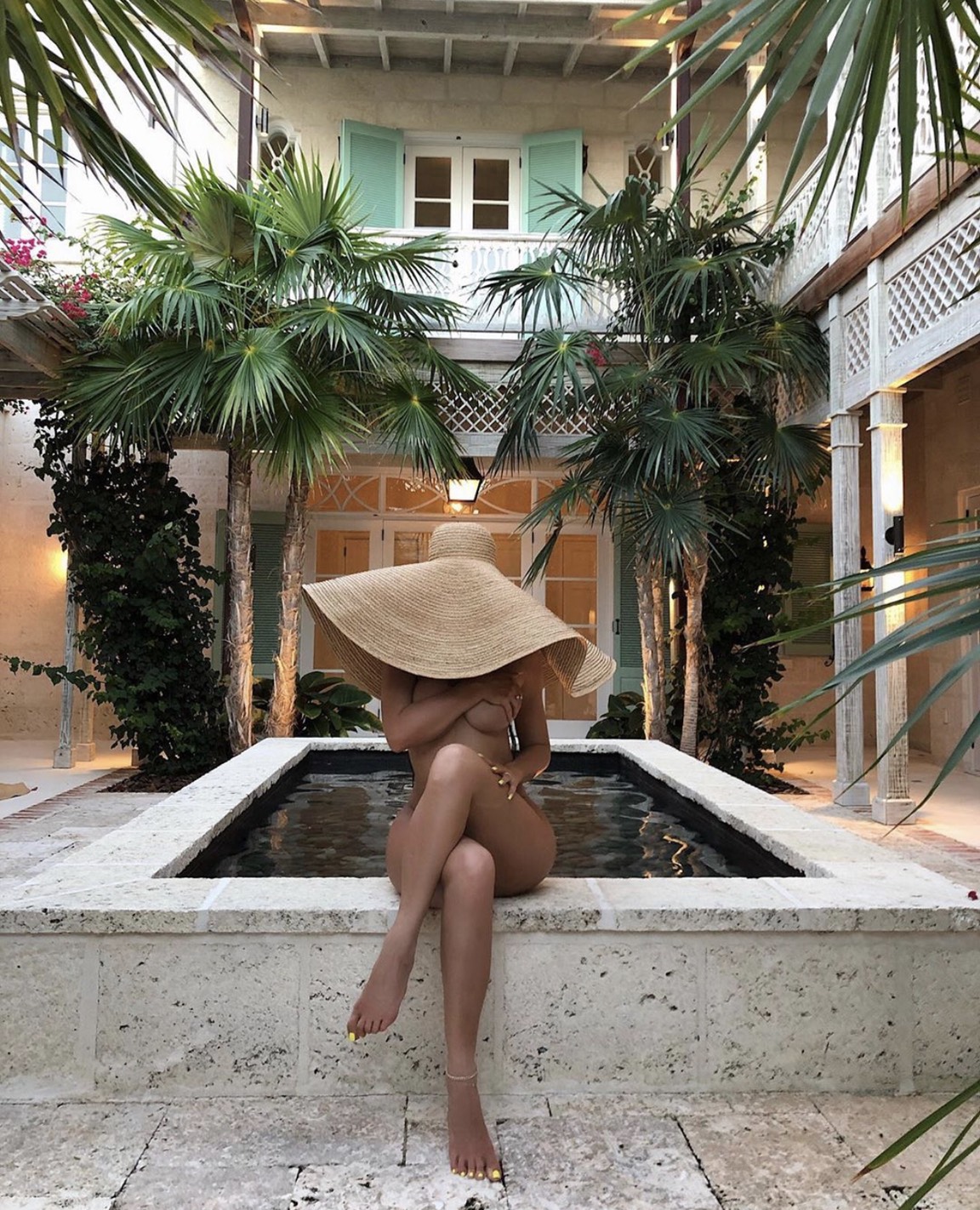 這一系列度假美照中,還有一張「一絲不掛」的辣照,照片中,凱莉·詹娜頭戴一頂超大草帽,完全擋住自己的臉,用一隻手遮擋自己的傲人上圍,但渾圓的胸型藏不住,並翹起自己的修長大美腿遮住重點部位,引起粉絲無限遐想。生過小孩還能維持如此火辣的身材,令人又羨慕又嫉妒。